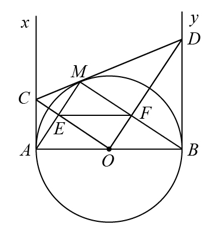 \text{M là điểm tùy ý trên đường tròn. Kẻ hai tia tiếp tuyến } Ax,\ By \text{ với đường tròn}